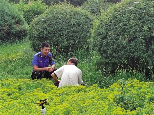 7月26日,包頭市九原區(qū)城市管理綜合執(zhí)法局的執(zhí)法人員發(fā)現(xiàn)一名男子因不適躺在草叢里,聯(lián)系到其家屬后,執(zhí)法人員一直陪伴到老人離開。