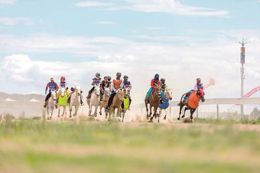 藍(lán)天白云下,駿馬馳騁。技藝精湛的騎手們在馬背上閃轉(zhuǎn)騰挪、策馬揚(yáng)鞭,“噠噠”蹄聲卷起塵土,一場精彩的賽馬“村超”正在百靈那達(dá)慕文化產(chǎn)業(yè)園上演。