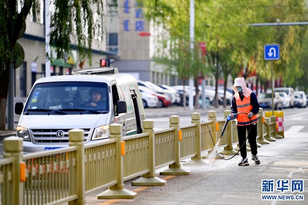 10月14日,伊金霍洛旗環(huán)衛(wèi)工人在清潔城區(qū)路面。