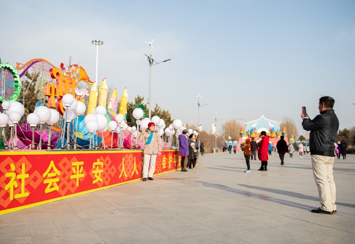 2月5日,在呼和浩特市阿爾泰游樂園,市民與春節(jié)元素的花燈合影留念。正月初一,人們來到年味十足的廣場、公園逛一逛,在花燈前合影留念,定格幸福瞬間。