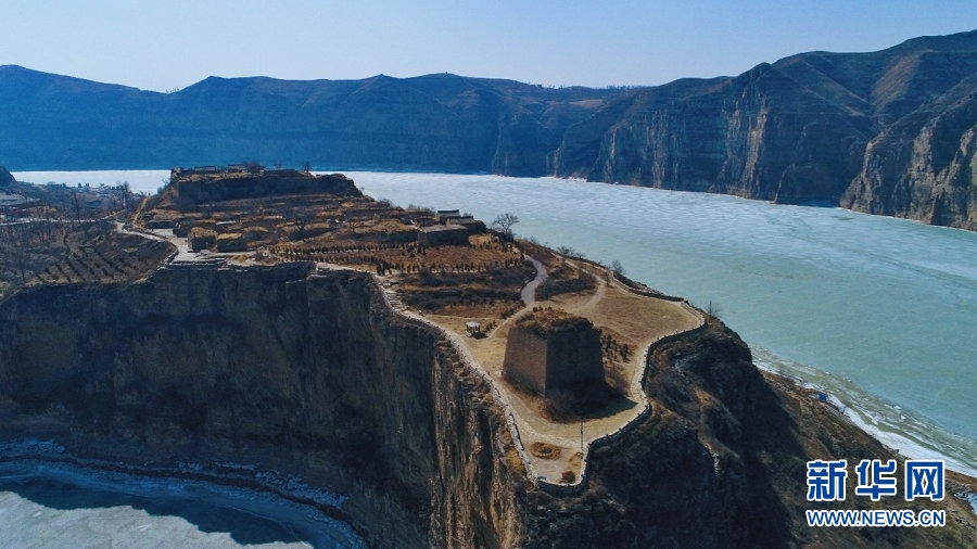 俯瞰老牛灣岸上的古村落與長城烽火臺。新華網發(fā)(樂炎攝)