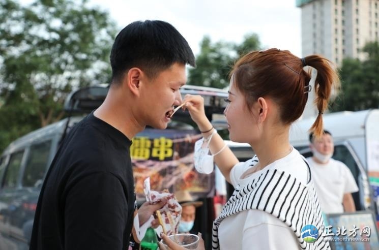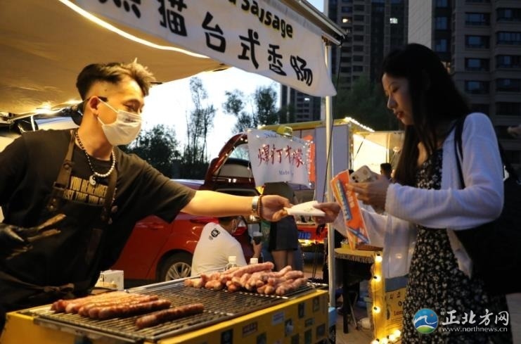 人間煙火氣,最撫凡人心。雖然已是21時(shí)許,但是后備廂集市依然人頭攢動(dòng),熱鬧非凡,叫賣聲不絕于耳。一家烤腸攤位前,攤主郭浩楠一邊招呼食客,一邊拿著夾子不緊不慢地翻動(dòng)著烤架上的烤腸,烤好后拿竹簽一穿,伴著滋滋作響的聲音,紅光透亮的烤腸瞬間香氣四溢。“已經(jīng)參加了好幾場了,一晚上能售出近百根烤腸,不過我的初衷不是為了賺錢,就是想把自己鐘情的美食分享給大家?!惫崎f。