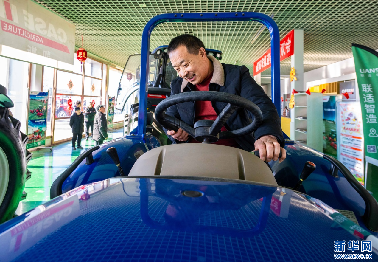 ??2月18日,在位于呼和浩特市玉泉區(qū)的一家農(nóng)機設(shè)備公司展銷大廳,農(nóng)戶在試駕拖拉機。新華網(wǎng)發(fā)(丁根厚 攝)
