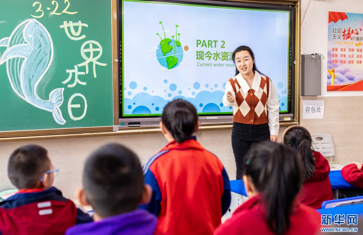 ??3月20日,呼和浩特市玉泉區(qū)石東路小學(xué)老師向?qū)W生們講解“保障我國水安全”等知識。新華網(wǎng)發(fā)(丁根厚 攝)