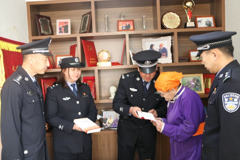 5月6日上午,民警們手捧鮮花來(lái)到都貴瑪老人家。一進(jìn)家門,便為都貴瑪老人送上了節(jié)日的祝福。民警們與都貴瑪老人嘮起了家常,詳細(xì)詢問(wèn)老人的身體狀況和生活情況。大家你一言,我一語(yǔ),聊著聊著,就談到了當(dāng)前開(kāi)展的黨史學(xué)習(xí)教育。民警們把自己的學(xué)習(xí)體會(huì)和收獲一一向都貴瑪老人作了匯報(bào)。都貴瑪老人說(shuō),自己也通過(guò)觀看《新聞聯(lián)播》了解到國(guó)家十四五開(kāi)局之年和全黨開(kāi)展黨史學(xué)習(xí)教育的相關(guān)內(nèi)容。特別是看到民警們帶來(lái)的黨史書籍時(shí),都貴瑪老人和大家講述了他們那一代人如何利用蒙文版書籍學(xué)習(xí)黨章黨史的故事,再次回顧了習(xí)近平總書記為她授予“人民楷?!眹?guó)家榮譽(yù)稱號(hào)獎(jiǎng)?wù)聲r(shí)的自豪和激動(dòng)。