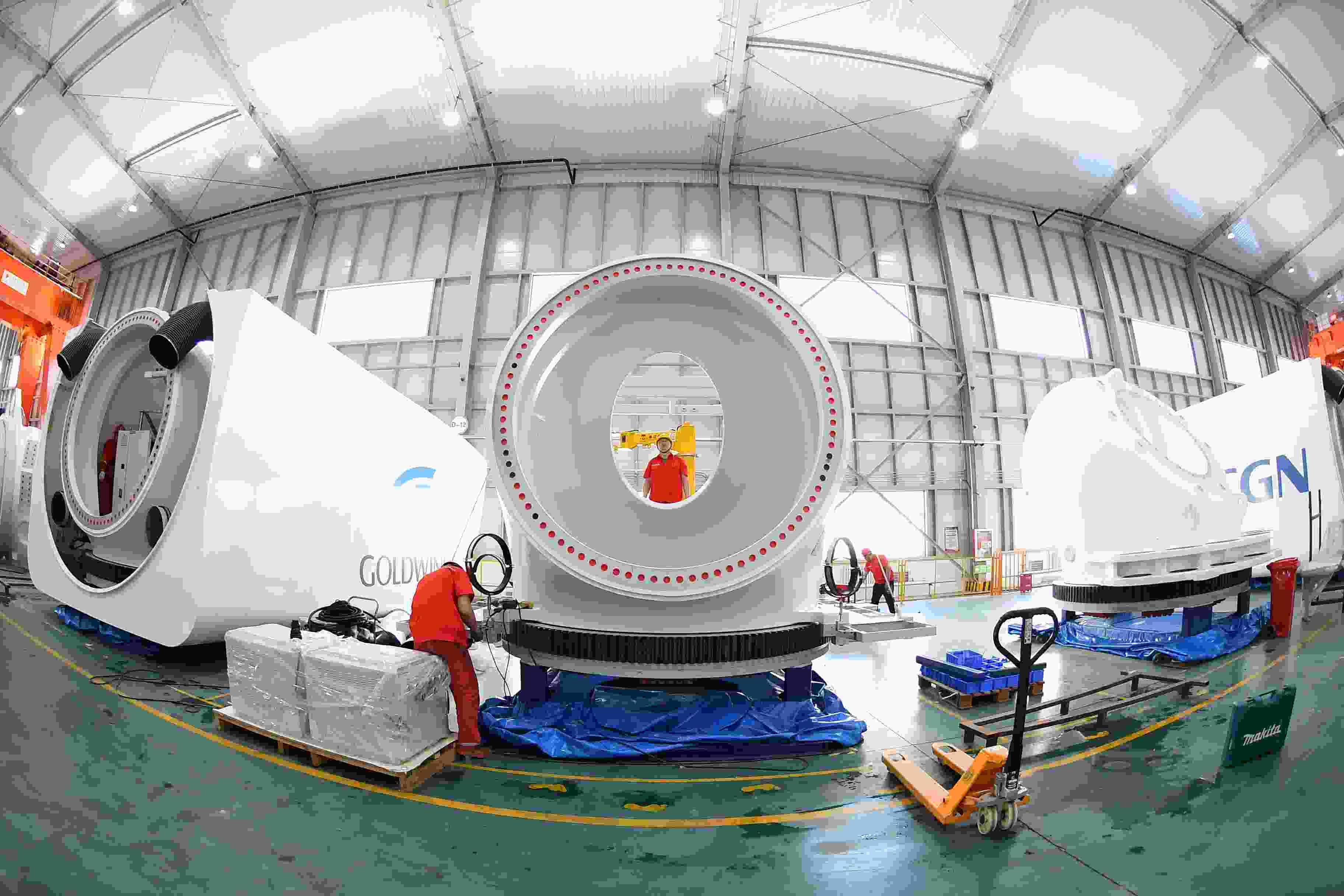 金風(fēng)科技公司工人在安裝風(fēng)機(jī)主機(jī)。金泉攝