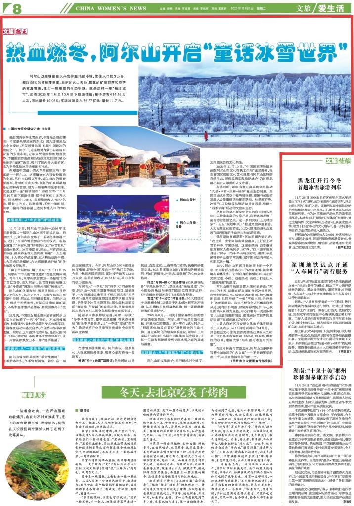 2025年12月2日,《中國(guó)婦女報(bào)》第8版刊發(fā)題為《熱血燃冬,阿爾山開啟“童話冰雪世界”》的新聞,報(bào)道了阿爾山,這座地處內(nèi)蒙古自治區(qū)興安盟的東北小城,近年來憑借獨(dú)特的地理優(yōu)勢(shì)、豐富的旅游資源和當(dāng)?shù)卣穆貌块T精心推出的“寵客”政策,吸引了國(guó)內(nèi)外大批游客,成為冬季體驗(yàn)冰雪快樂的打卡地。