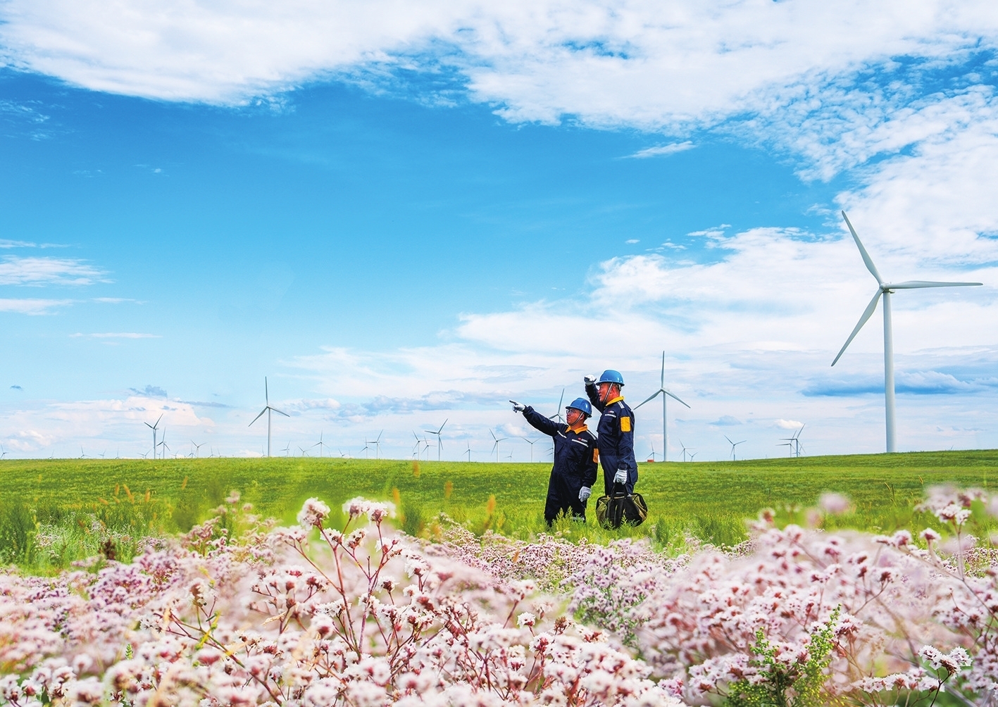 近日,國華投資蒙東分公司輝騰梁風(fēng)電場內(nèi),風(fēng)機群與遍野花海相映成趣,兩名風(fēng)電運維工程師,正在交流剛處理完的偏航故障細節(jié),核對風(fēng)速儀、風(fēng)向標校準數(shù)據(jù),討論后續(xù)防沙維護措施,同時檢查設(shè)備運行狀態(tài),確保風(fēng)機穩(wěn)定發(fā)電。