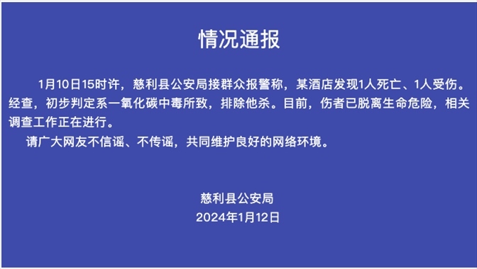 湖南慈利一酒店發(fā)現(xiàn)1人死亡、1人受傷,警方:初判系一氧化碳中毒所致 1月12日,湖南慈利縣公安局通報,1月10日15時許,慈利縣......