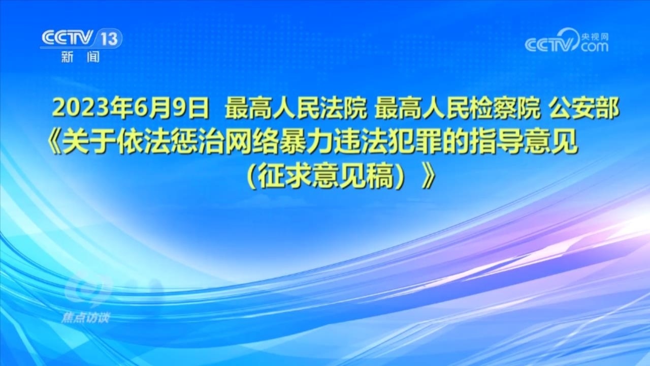 央視網(wǎng)消息(焦點(diǎn)訪談):俗話說“舌上有龍泉,殺人不見血”。網(wǎng)絡(luò)暴力不同于現(xiàn)實(shí)中的拳腳相加,但是這些在網(wǎng)絡(luò)空間中用文字、圖片等方式進(jìn)行的傷害和侮辱,一樣可以對(duì)當(dāng)事人的現(xiàn)實(shí)生活產(chǎn)生惡劣的影響,讓當(dāng)事人的心靈“流血”。在傷害當(dāng)事人的同時(shí),網(wǎng)絡(luò)暴力行為也嚴(yán)重污染了互聯(lián)網(wǎng)環(huán)境,影響社會(huì)和諧穩(wěn)定。近日,國家互聯(lián)網(wǎng)信息辦公室起草了《網(wǎng)絡(luò)暴力信息治理規(guī)定(征求意見稿)》,向社會(huì)公開征求意見;同樣是針對(duì)網(wǎng)絡(luò)暴力,在6月,最高人民法院、最高人民檢察院、公安部起草了《關(guān)于依法懲治網(wǎng)絡(luò)暴力違法犯罪的指導(dǎo)意見(征求意見稿)》,面向社會(huì)公開征求意見。治理網(wǎng)絡(luò)暴力這顆“毒瘤”,營造良好生態(tài)勢(shì)在必行。