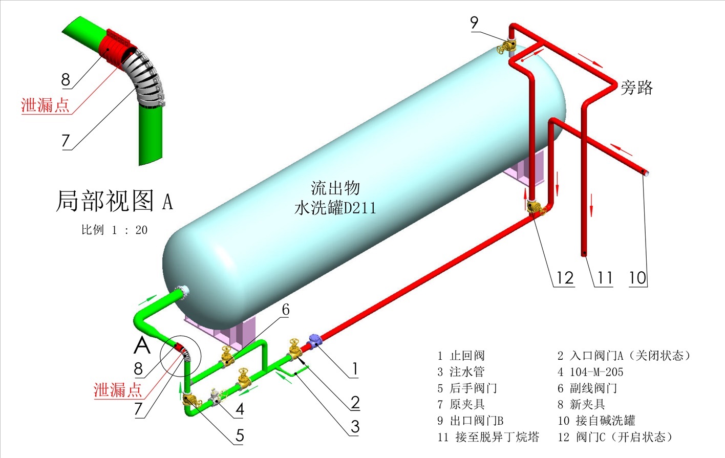 13時(shí)24分10秒,在新夾具兩側(cè)各安裝緊固1套螺栓時(shí),原夾具水平端的管道焊縫處突然斷裂,大量介質(zhì)從斷口噴出?,F(xiàn)場(chǎng)監(jiān)護(hù)人員立即向外疏散并安排烷基化裝置內(nèi)操人員緊急停車(chē)。
