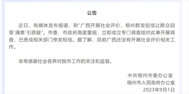 ·網(wǎng)傳廣西開展社會評價,梧州群發(fā)短信讓群眾回答“滿意”,梧州市政府:開展調(diào)查,已責(zé)成相關(guān)部門停發(fā)短信。據(jù)了解廣西還未開展社會評價相關(guān)工作。