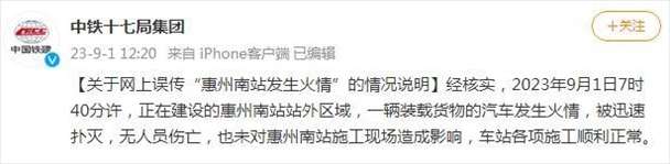 ·中鐵十七局集團發(fā)布對“惠州南站發(fā)生火情”的說明:一輛裝載貨物的汽車發(fā)生火情,被迅速撲滅,未造成人員、財產(chǎn)傷亡。
