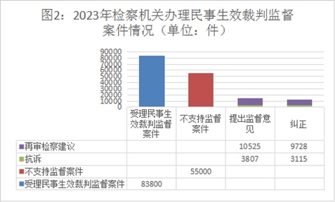 2023年,全國(guó)檢察機(jī)關(guān)始終堅(jiān)持以習(xí)近平新時(shí)代中國(guó)特色社會(huì)主義思想特別是習(xí)近平法治思想為指導(dǎo),認(rèn)真貫徹落實(shí)《中共中央關(guān)于加強(qiáng)新時(shí)代檢察機(jī)關(guān)法律監(jiān)督工作的意見(jiàn)》,以“高質(zhì)效辦好每一個(gè)案件”作為履職辦案的基本價(jià)值追求,以專業(yè)化建設(shè)為基礎(chǔ),以提升辦案能力和水平為目標(biāo),認(rèn)真貫徹實(shí)施民法典,扎實(shí)推進(jìn)民事生效裁判監(jiān)督、審判活動(dòng)監(jiān)督、執(zhí)行活動(dòng)監(jiān)督、支持起訴、虛假訴訟監(jiān)督等各項(xiàng)工作,在完善案卷調(diào)閱制度、民事再審檢察建議制度、促進(jìn)社會(huì)治理等方面取得新進(jìn)展新成效。