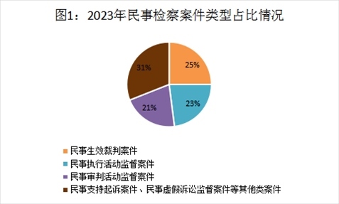 2023年,全國(guó)檢察機(jī)關(guān)民事檢察監(jiān)督規(guī)模進(jìn)一步擴(kuò)大,全流程監(jiān)督格局逐步完善,總體發(fā)展保持均衡態(tài)勢(shì)。全年共受理各類(lèi)民事檢察案件33.29萬(wàn)件,案件數(shù)量持續(xù)上升。其中,民事生效裁判案件占受理總數(shù)的25%,民事執(zhí)行活動(dòng)監(jiān)督案件占23%,民事審判活動(dòng)監(jiān)督案件占21%,民事支持起訴案件、民事虛假訴訟監(jiān)督案件等其他類(lèi)案件占31%。