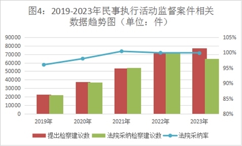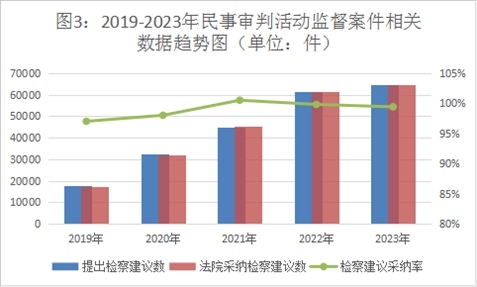 2023年,全國(guó)檢察機(jī)關(guān)共受理民事審判活動(dòng)監(jiān)督案件6.94萬(wàn)件,同期審結(jié)6.96萬(wàn)件(含積存)。提出檢察建議6.47萬(wàn)件,同比上升5.1%,占審結(jié)案件數(shù)的93%,同比增加4.2個(gè)百分點(diǎn)。對(duì)提出的檢察建議,法院同期采納6.46萬(wàn)件,檢察建議采納率達(dá)99%。一些地區(qū)通過(guò)開(kāi)展專項(xiàng)監(jiān)督,加強(qiáng)辦案力度,提高辦案效果,推動(dòng)民事審判活動(dòng)監(jiān)督向深層次違法監(jiān)督轉(zhuǎn)變。