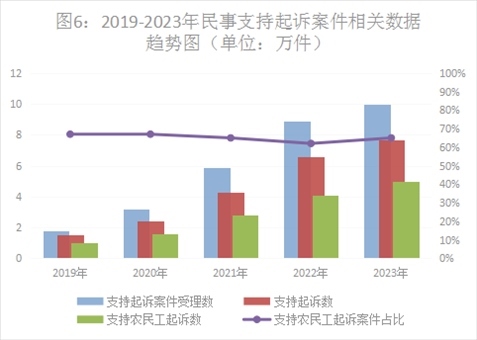 一是民事支持起訴數(shù)量上升較快。2023年,全國(guó)檢察機(jī)關(guān)共受理民事支持起訴案件10.14萬(wàn)件,同比上升13.9%,審查后支持起訴7.73萬(wàn)件,其中支持農(nóng)民工起訴5.08萬(wàn)件。從案件類(lèi)型上看,主要以勞動(dòng)爭(zhēng)議(占43.9%)、合同糾紛(占33%)、婚姻家庭糾紛(占6.7%)為主。