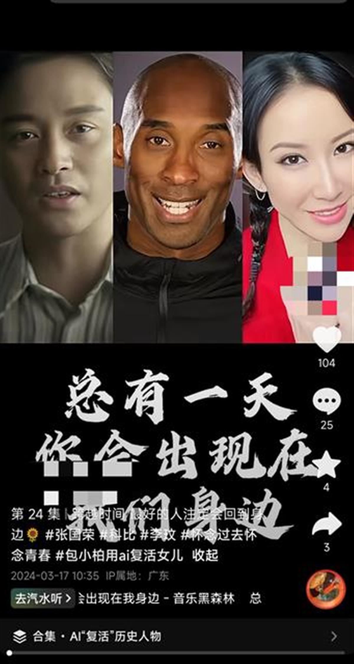 在社交平臺(tái),類似的“AI復(fù)活師”賬號(hào)仍在活躍。這些賬號(hào)通過(guò)發(fā)布科比、李玟、張國(guó)榮等已逝名人的AI視頻吸引觀眾,并在簡(jiǎn)介中聲稱可以通過(guò)AI技術(shù)定制數(shù)字人、克隆聲音、修復(fù)照片,還能“復(fù)活”已逝親人,定制他們的音頻視頻。目前,部分“AI復(fù)活師”的視頻已被平臺(tái)標(biāo)注“內(nèi)容疑似AI生成,請(qǐng)謹(jǐn)慎甄別”。
