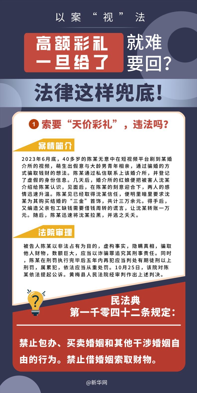 “五一”長(zhǎng)假期間,各地迎來了婚禮高峰期,“彩禮”話題,尤其農(nóng)村高額彩禮現(xiàn)象備受關(guān)注。破解高價(jià)彩禮,在解決爭(zhēng)議的層面,司法盡了最大努力兜底。本期《以案“視”法》針對(duì)涉“高額彩禮”糾紛,帶大家學(xué)習(xí)相關(guān)法律知識(shí)。