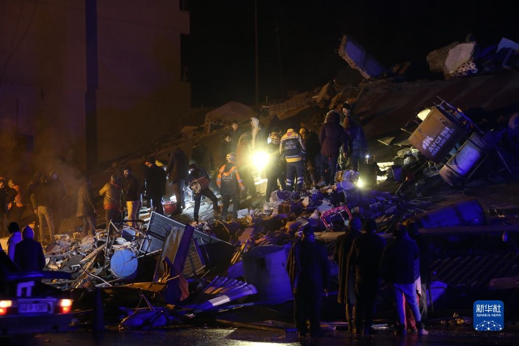 2月6日,救援人員在土耳其南部地震重災(zāi)區(qū)卡赫拉曼馬拉什省帕扎爾哲克倒塌的建筑中搜尋幸存者。新華社發(fā)(穆斯塔法·卡亞攝)