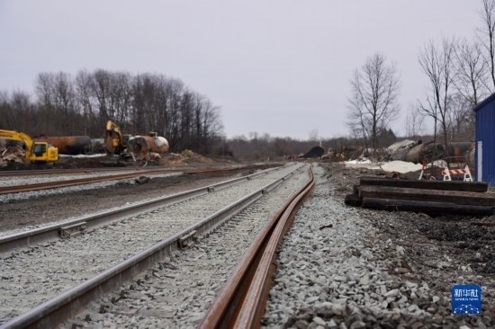 這是2月14日在美國(guó)俄亥俄州東巴勒斯坦鎮(zhèn)列車脫軌事故現(xiàn)場(chǎng)附近拍攝的鐵軌。新華社發(fā)(章焱飛攝)