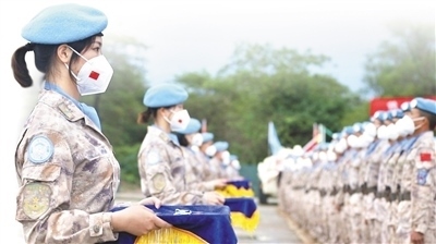 2022年9月30日,中國(guó)第八批赴南蘇丹(朱巴)維和步兵營(yíng)700名維和官兵被聯(lián)合國(guó)授予“和平榮譽(yù)勛章”,以表彰他們?cè)趫?zhí)行維和任務(wù)期間的卓越表現(xiàn)和為南蘇丹和平事業(yè)作出的突出貢獻(xiàn)。圖為授勛儀式現(xiàn)場(chǎng)。 孫雪松攝(新華社發(fā))