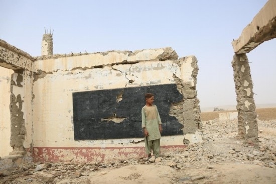 2022年8月23日,在阿富汗南部赫爾曼德省桑金地區(qū),一名男孩站在廢墟之中。桑金地區(qū)曾經(jīng)最繁華的市場,如今遍布美軍空襲留下的一個(gè)個(gè)巨大彈坑。