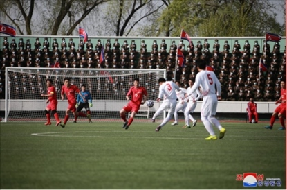 報道稱,首先進(jìn)行了朝鮮內(nèi)閣和國防省職員的足球比賽,兩隊攻防激烈,最終以1:1戰(zhàn)平,隨后進(jìn)入了點球大戰(zhàn),國防省隊以5:3力克內(nèi)閣隊。