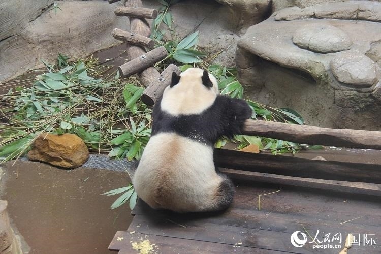 記者趕到時(shí),離開爸爸媽媽單獨(dú)生活的“圓夢(mèng)”正躺在木床上呼呼大睡,四仰八叉的可愛模樣吸引游客們紛紛駐足,拍照留念。動(dòng)物園工作人員介紹說,“圓夢(mèng)”現(xiàn)在已經(jīng)五歲多了,體重超過100公斤,身高也同成年大熊貓無差,活潑好動(dòng)、元?dú)鉂M滿。隨著飼養(yǎng)員往園內(nèi)投入新鮮的竹子,“圓夢(mèng)”也慢慢醒過來,開始享用竹子大餐?!拔铱梢砸徽煸谶@里看它吃飯!真的太可愛了!這是我在動(dòng)物園最喜歡的動(dòng)物!”今年8歲的梅麗莎興奮地說。
