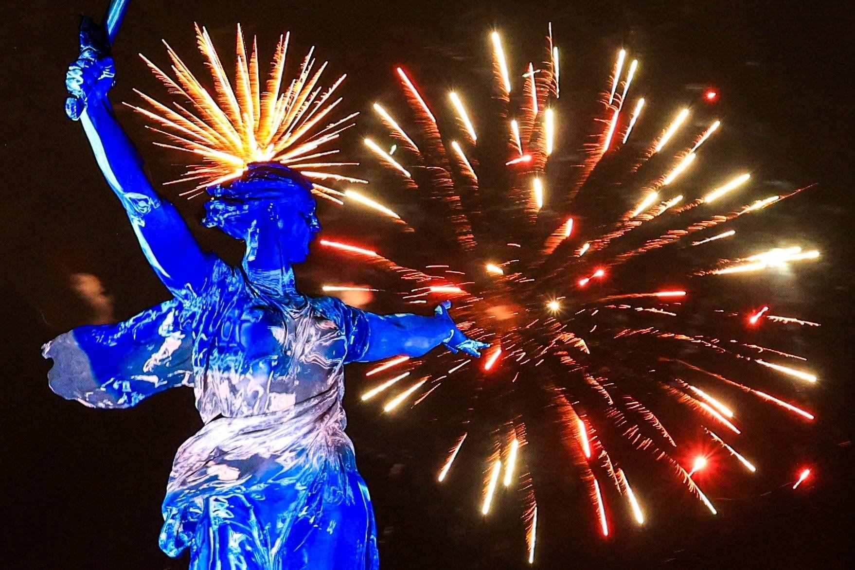 當(dāng)?shù)貢r(shí)間2023年5月9日,俄羅斯伏爾加格勒,紀(jì)念衛(wèi)國戰(zhàn)爭勝利78周年,煙花在馬馬耶夫山崗的祖國召喚雕像上綻放。 視覺中國
