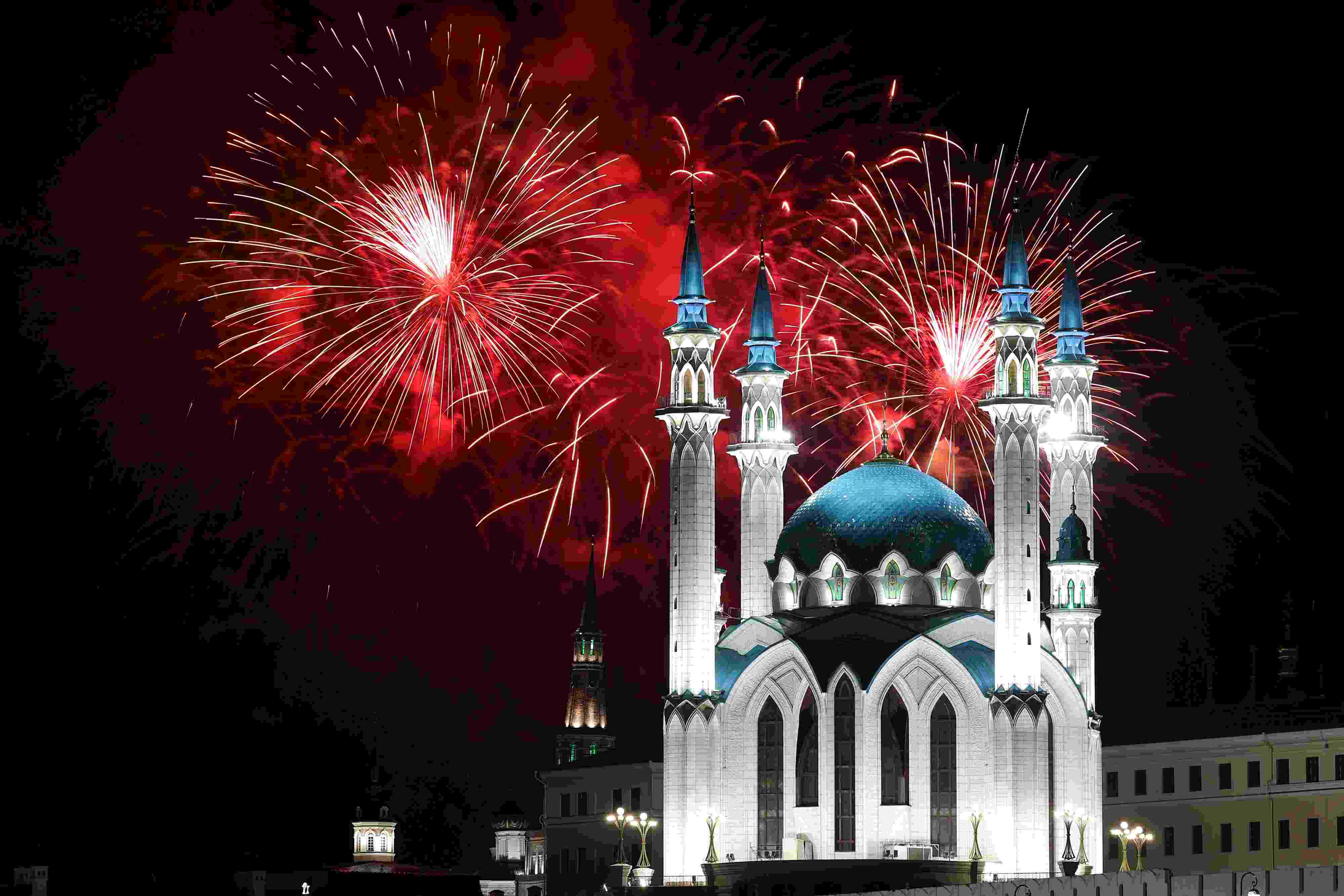 當(dāng)?shù)貢r(shí)間2023年5月9日,俄羅斯喀山,紀(jì)念衛(wèi)國戰(zhàn)爭勝利78周年,庫爾沙里夫清真寺燃放煙花。視覺中國