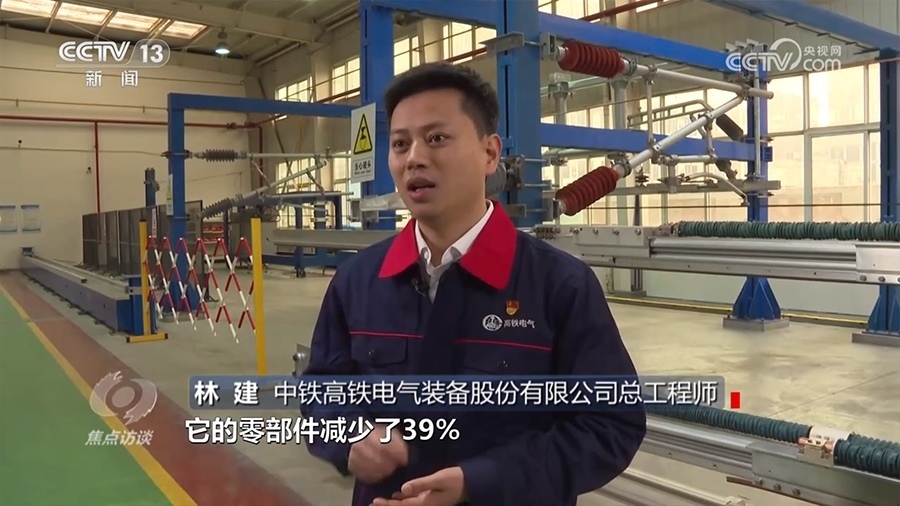 中鐵高鐵電氣裝備股份有限公司總工程師林建:“簡(jiǎn)統(tǒng)化腕臂裝置相對(duì)于傳統(tǒng)的鋁合金三角腕臂裝置來(lái)說(shuō),它的零部件減少了39%,在運(yùn)營(yíng)過(guò)程中,在同等滿足系統(tǒng)使用要求情況下,零部件越少,故障率越小,安全可靠性就會(huì)更高。”