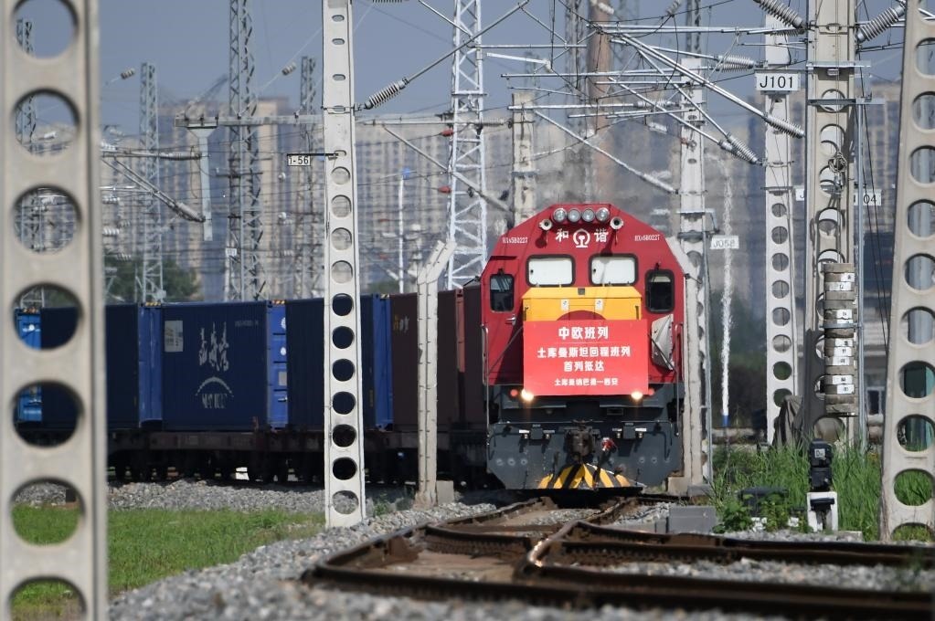 滿載土庫曼斯坦甘草中藥材原料的中歐班列回程列車抵達(dá)西安國際港站(2022年8月31日攝,無人機(jī)照片)。 新華社記者李一博攝