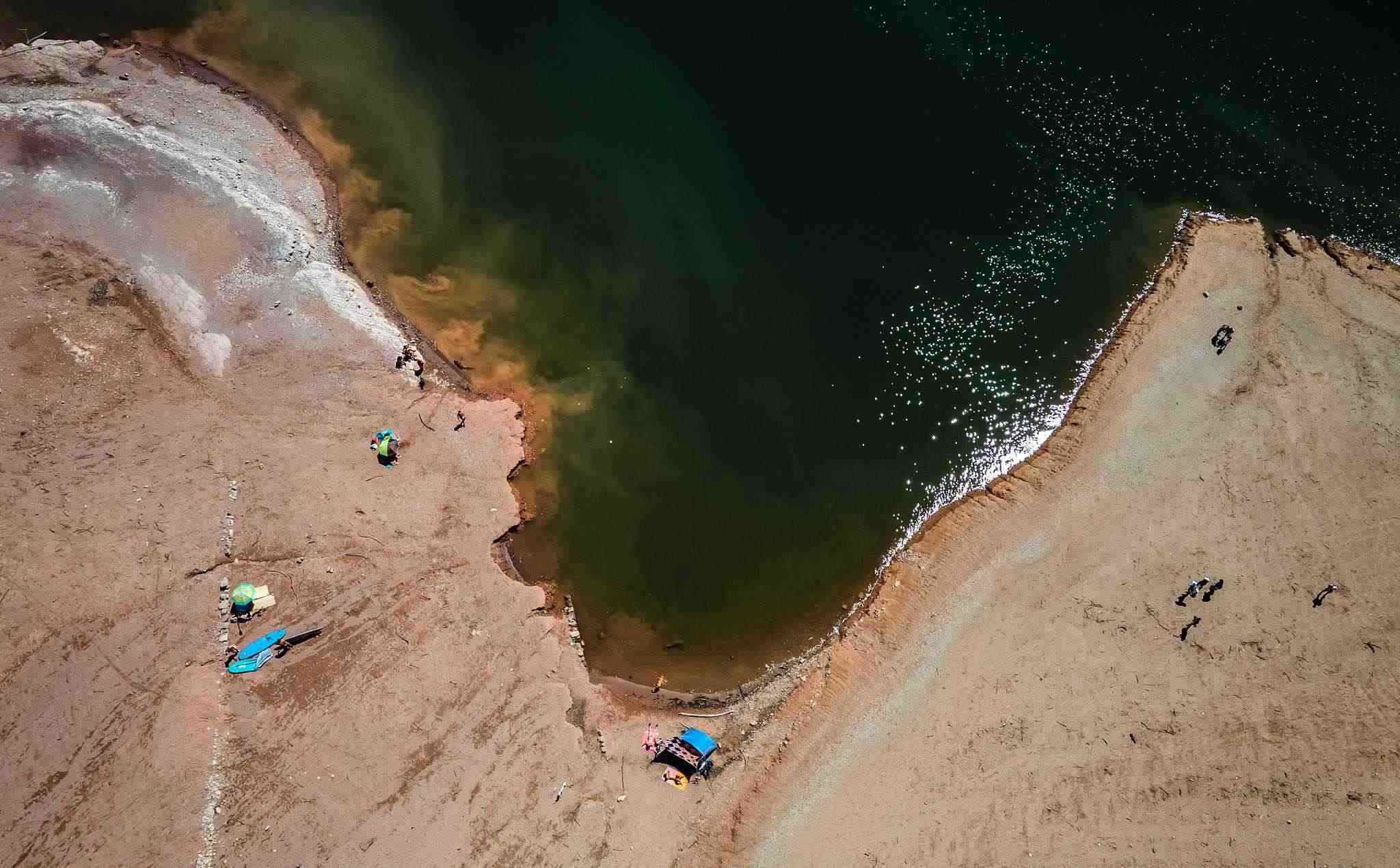 當(dāng)?shù)貢r間2023年4月16日,美國內(nèi)華達(dá)州,棕色的科羅拉多河流經(jīng)水位下降的米德湖。