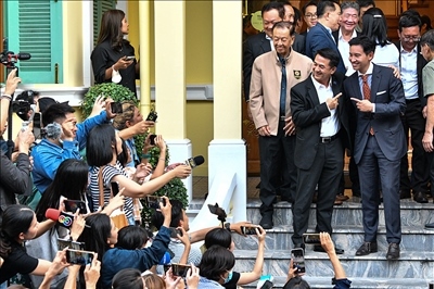 當(dāng)?shù)貢r(shí)間2023年5月17日,泰國曼谷,泰國遠(yuǎn)進(jìn)黨黨魁皮塔與泰國為泰黨黨魁春拉南在與聯(lián)盟伙伴舉行會(huì)議后合影。