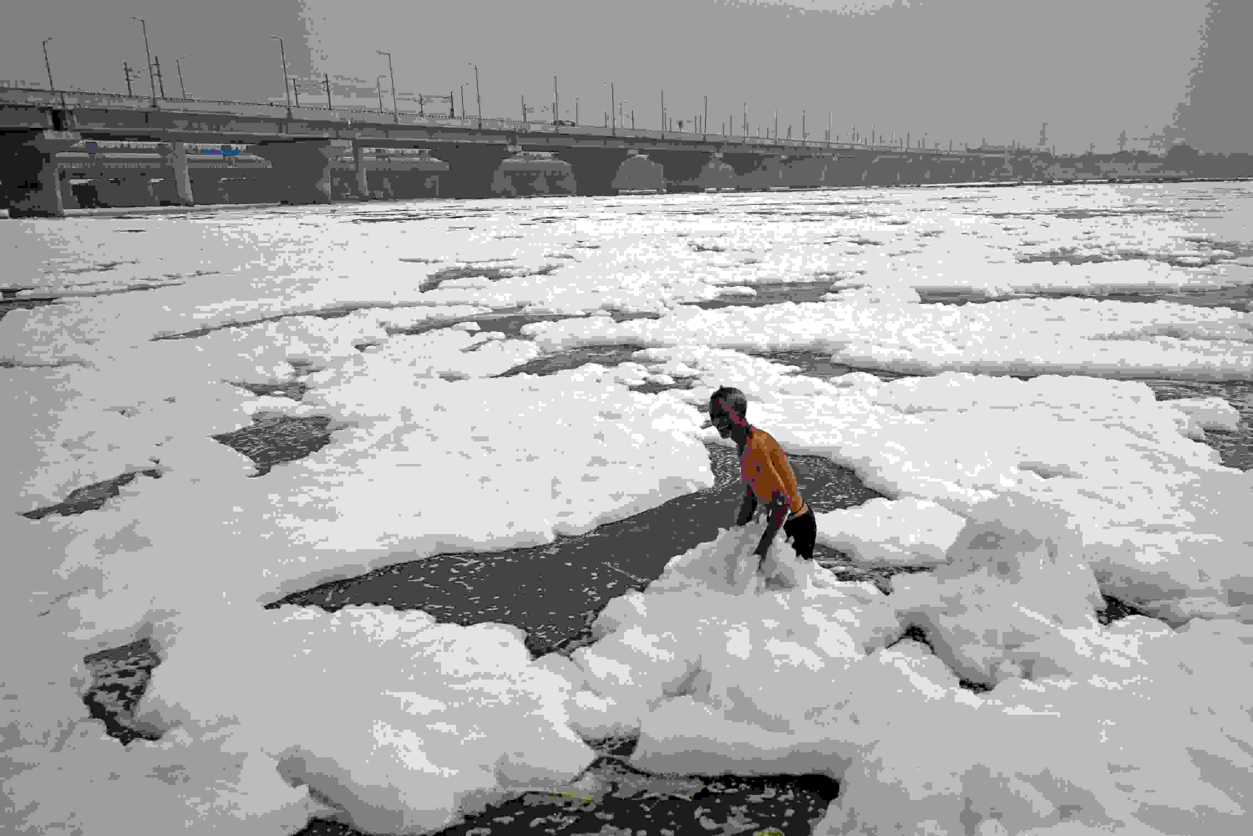 當(dāng)?shù)貢r(shí)間2023年6月4日,印度新德里,世界環(huán)境日前夕,人們?cè)诔錆M有毒泡沫的亞穆納河中沐浴。 視覺中國(guó)