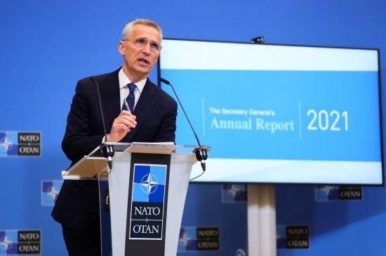 2022年3月31日,在比利時(shí)布魯塞爾,北約秘書長斯托爾滕貝格在新聞發(fā)布會上講話。新華社記者鄭煥松攝
