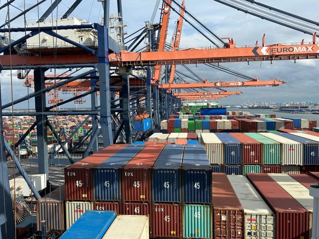 9月20日,“中遠海運室女座”號集裝箱船停靠在荷蘭鹿特丹港作業(yè)。新華社發(fā)
