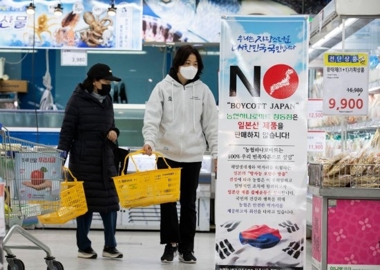 2021年4月14日,韓國首爾的一家農(nóng)協(xié)連鎖超市的水產(chǎn)商品貨架前打出“抵制日本”、“本店不銷售日本產(chǎn)產(chǎn)品”等標(biāo)語,對日本政府決定將福島第一核電站核污染水排入大海表示抗議。 新華社發(fā)(徐儒錫攝)