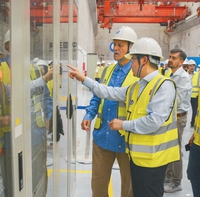巴基斯坦卡洛特水電站是中巴經(jīng)濟(jì)走廊首個(gè)水電投資項(xiàng)目,由中國(guó)三峽集團(tuán)投資開(kāi)發(fā)建設(shè),運(yùn)營(yíng)一年來(lái)節(jié)約標(biāo)準(zhǔn)煤約140萬(wàn)噸,減少二氧化碳排放約350萬(wàn)噸。圖為中方技術(shù)人員向來(lái)訪(fǎng)的巴基斯坦代表團(tuán)介紹水電站運(yùn)行情況。本報(bào)巴基斯坦分社 薩義德·邁赫迪攝