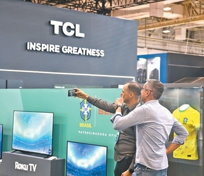 在2023年圣保羅國際消費(fèi)類電子及家用電器產(chǎn)品展覽會(huì)上,參觀者在TCL展臺(tái)前合影留念。本報(bào)記者 時(shí)元皓攝