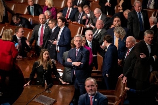 這是1月6日在美國華盛頓國會(huì)拍攝的凱文·麥卡錫(中)。新華社記者劉杰攝