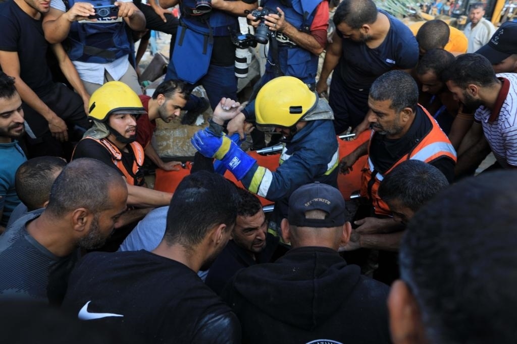 10月16日,在加沙地帶南部城市汗尤尼斯,人們在遭以色列襲擊后的建筑廢墟中救援傷者。新華社發(fā)(亞西爾·庫迪攝)