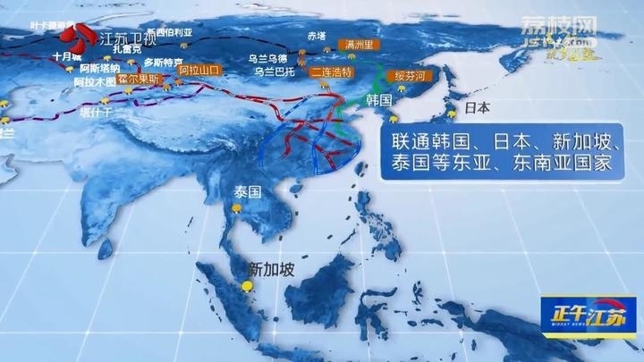 在東端,聯(lián)通韓國、日本等東亞國家以及新加坡、泰國等東南亞國家。