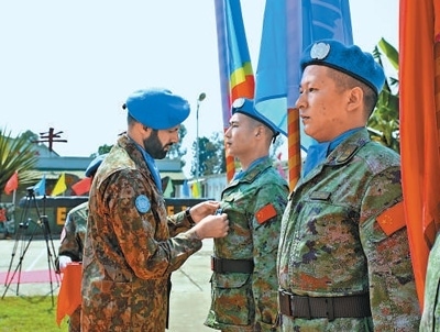 7月25日,剛果(金)南基伍省布卡武市中國半島營區(qū)。在高高飄揚的聯合國旗幟和中國、剛果(金)兩國國旗下,中國第二十六批赴剛果(金)維和部隊全體官兵被授予聯合國“和平勛章”。