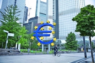 7月27日,一名男子騎車經(jīng)過德國法蘭克福的歐元標志。新華社發(fā)