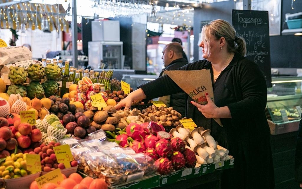 12月20日,在德國(guó)法蘭克福“小市場(chǎng)大廳”,一名攤主為顧客挑選水果。新華社記者張帆攝