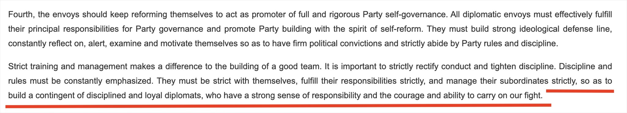 “鐵軍”一詞常見于政府文件或領(lǐng)導人講話,更多的是強調(diào)工作作風和紀律。在近年來中國領(lǐng)導人講話中,曾多次出現(xiàn)“紀律監(jiān)察鐵軍”“生態(tài)環(huán)境保護鐵軍”等表述。中國領(lǐng)導人在接見與會使節(jié)時的講話中說:“打造一支對黨忠誠、勇于擔當、敢斗善斗、紀律嚴明的外交鐵軍?!蓖饨徊烤W(wǎng)站對這句話的英文翻譯(見下圖)同樣強調(diào)外交隊伍的紀律、責任和勇氣。作為通行做法,世界各國對本國外交人員都有著很高的紀律要求。