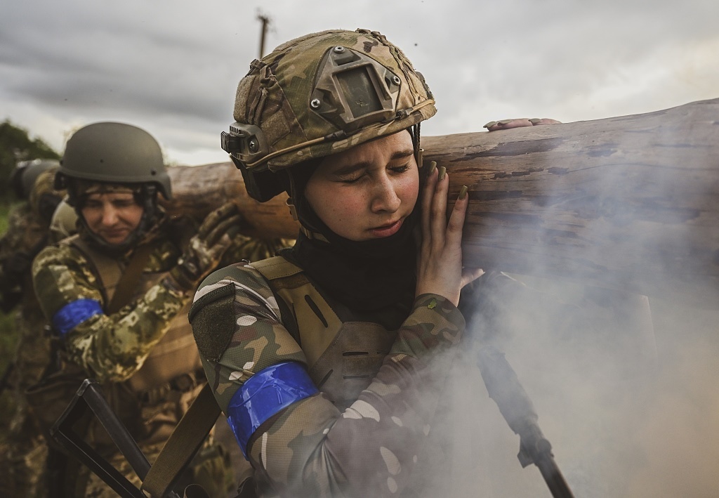 當(dāng)?shù)貢r間2023年7月15日,扎波羅熱地區(qū),烏克蘭女兵進(jìn)行力量配合進(jìn)行訓(xùn)練。