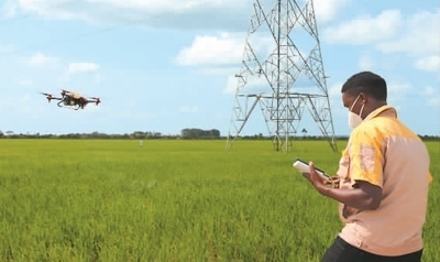在烏干達卡隆古區(qū)盧卡亞鎮(zhèn)中億農(nóng)業(yè)園,作業(yè)員赫伯特·阿加巴操控植保無人機噴灑農(nóng)藥。新華社記者 張改萍攝